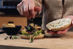 Saml nu din bagel med først persille humus på bunden, efterfulgt af hjerte salaten og de bagte rodfrugter, skær steaken i tynde skiver og kom bøffen på top op med de stegte svampe.