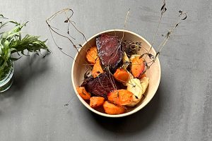 Skræl og skær dine rodfrugter i mund rette størrelser, kom dem i ildfast fad med olivenolie og timian, salt og friskkværnet peber, sættes i en forvarmet ovn 200 grader i 35-45 minuttere.